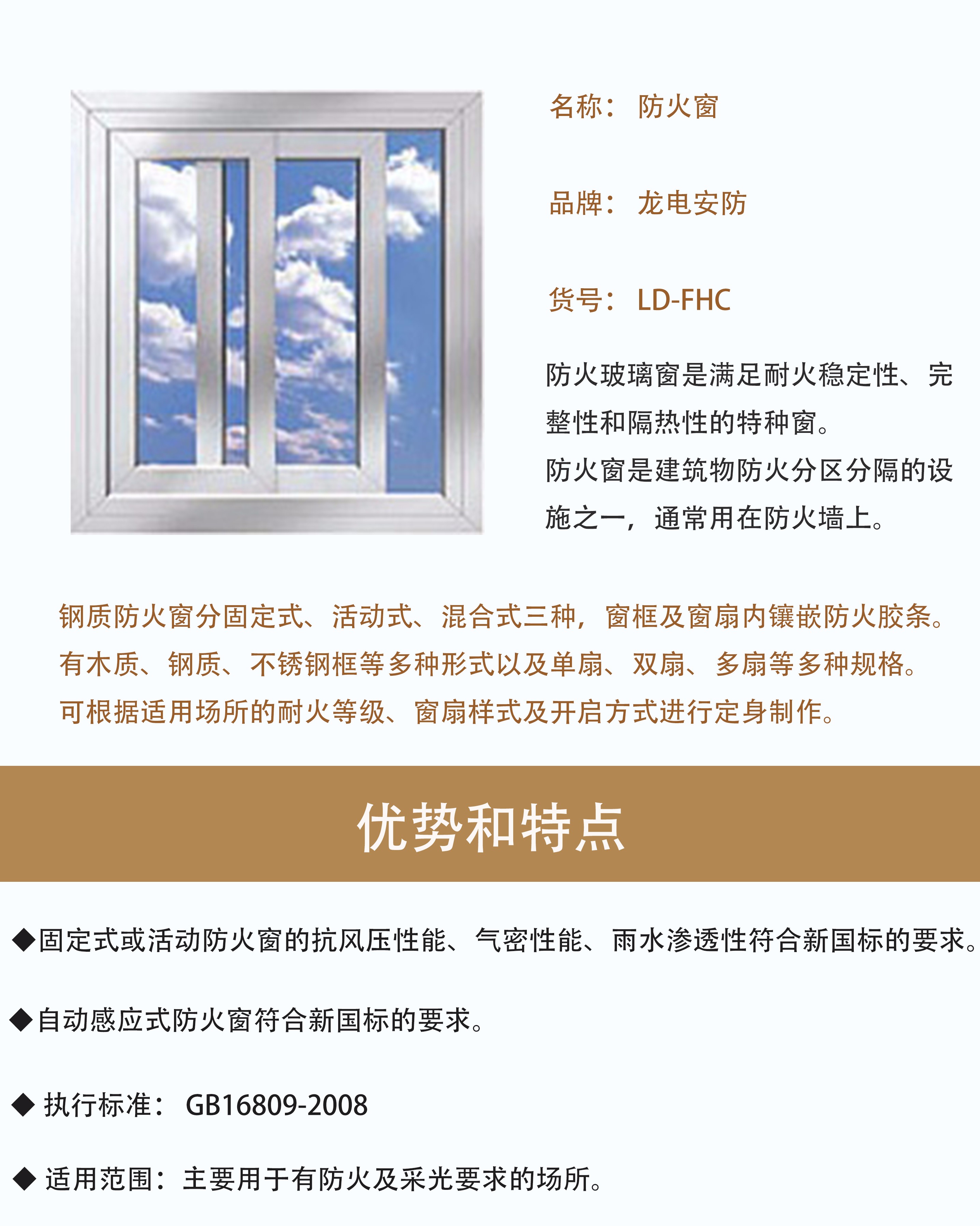 • 鋼質(zhì)防火窗分固定式、活動(dòng)式、混合式三種,窗框及窗扇內(nèi)鑲嵌防火膠條